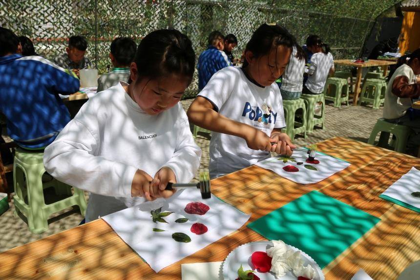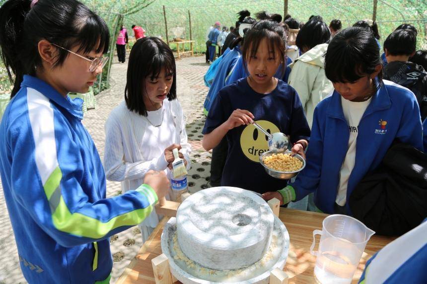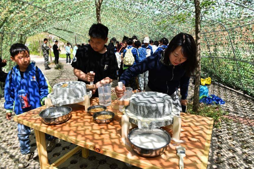 孩子们体验植物拓染技艺现场。张宝摄石磨轻旋,豆香漫过青石院墙,孩童握杆推动的剪影跃动在斑驳光影里;木槌起落,花瓣与青草在棉布上绽出红绿相生的图腾。“五一”假期,燕山深处的河北省青龙满族自治县大森店村变身露天工坊,来自不同地区中小学生在非遗传承人指导下,解锁磨豆浆、植物拓染等传统技艺密码。